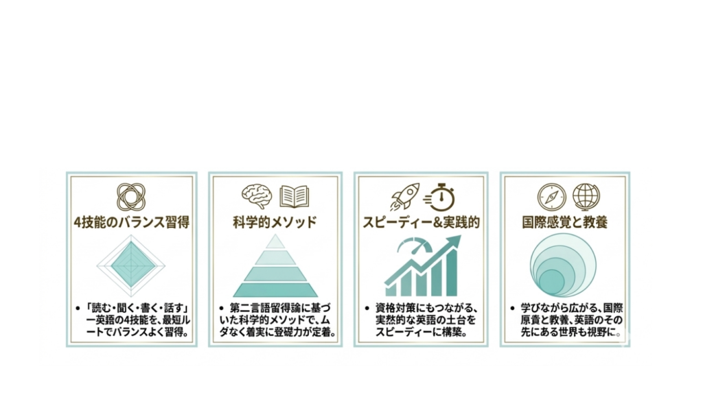 英語の「土台」をしっかり築いたうえで、実践で使える力へと育てます。
